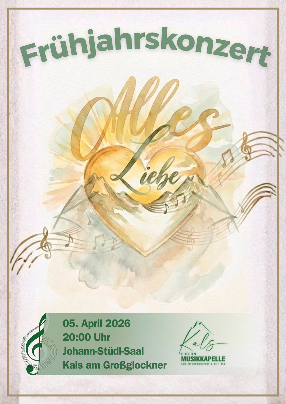 Als neugewählter Obmann freut es mich ganz besonders, euch herzlich zu unserem Frühjahrskonzert am Ostersonntag, den 5. April, einzuladen. Unter dem Motto „Alles Liebe“ erwartet euch ein stimmungsvoller Abend voller Musik und Emotionen. Gemeinsam mit unseren Musikerinnen und Musikern freuen wir uns darauf, euch einen besonderen Konzertabend zu bereiten.